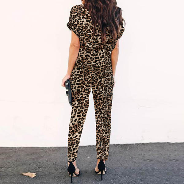 Sexy V-neck Short Sleeve High Waist Leopard Printed Jumpsuit