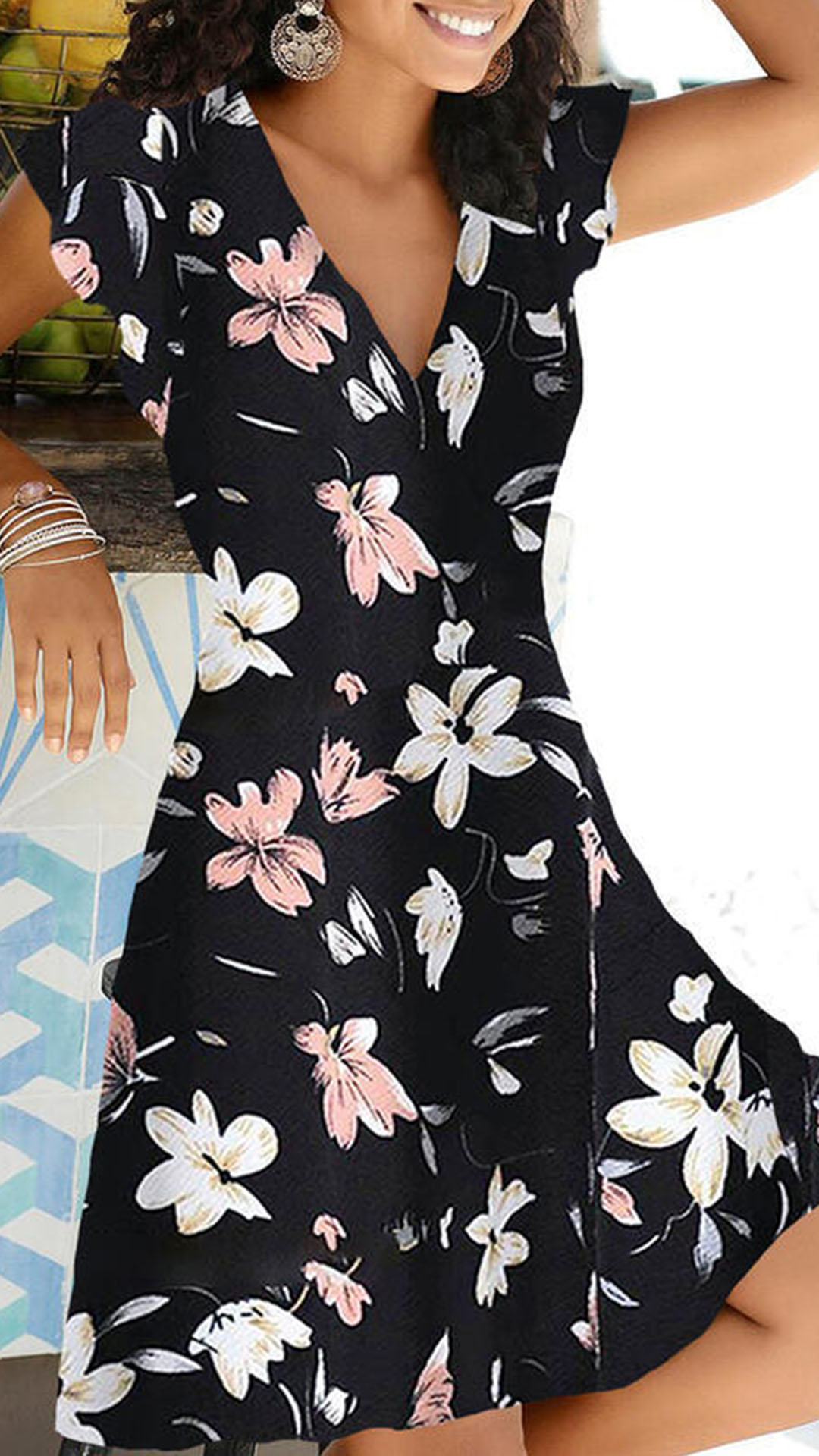 Make your summer wardrobe more complete by adding this beautiful printed dress. It features vibrant floral print details,which can offer you a more eye-catching look. In addition,the v-neck design also can enhance your feminine appeal. From your daytime out to night dating,this dress can give you a perfect transition.