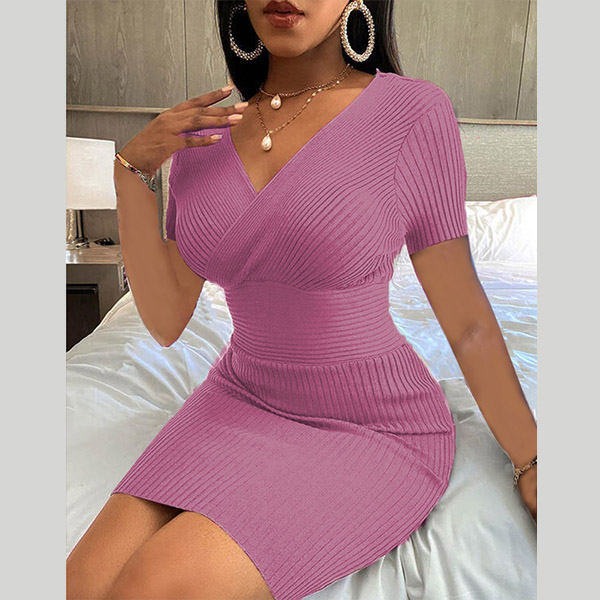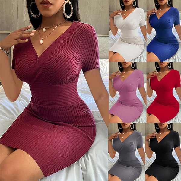Thanks to the high waist and tight silhouette design,your slender figure can have a full display in this dress. Comes with a solid color,finished with short sleeve and deep v-neck design,this dress also can enhance your feminine appeal. It has several different colors for your optional.
