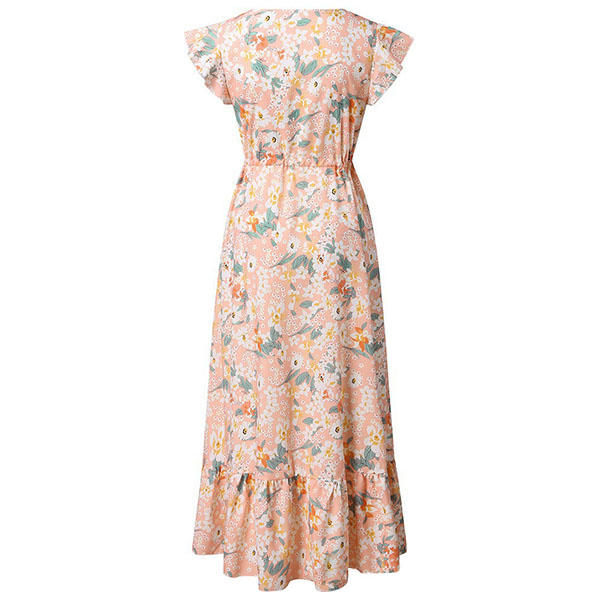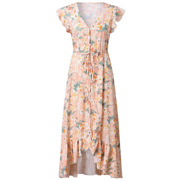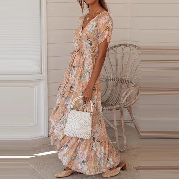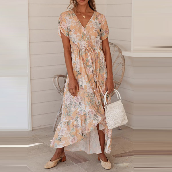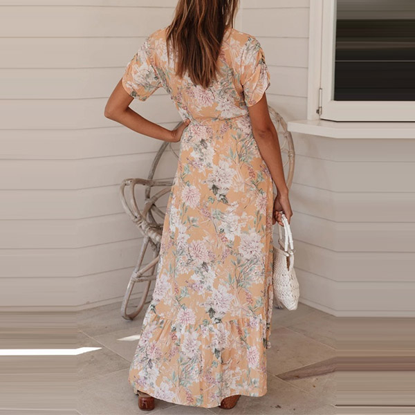 Wanna a beautiful beach look? Then dress yourself up with this printed dress. Features vibrant floral print details,finished with short sleeve,v-neck and an irregular ruffle hem,this dress knows how to make you look charming and stunning!
