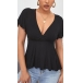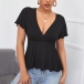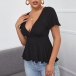 Sexy V-neck Short Sleeve Ruffle Hem High Waist Solid Color Top T-shirt