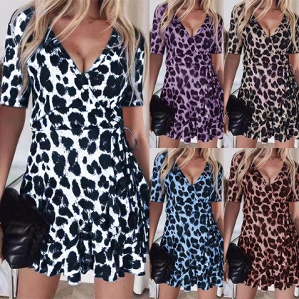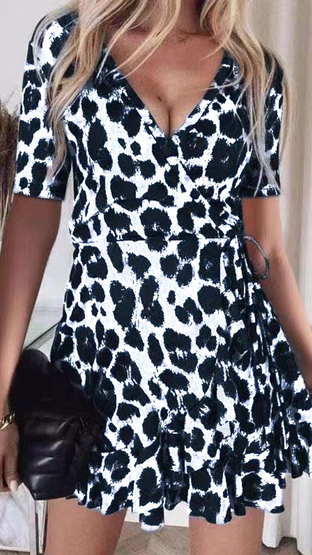 Sexy V-neck Short Sleeve Ruffle Hem Leopard Printed Dress