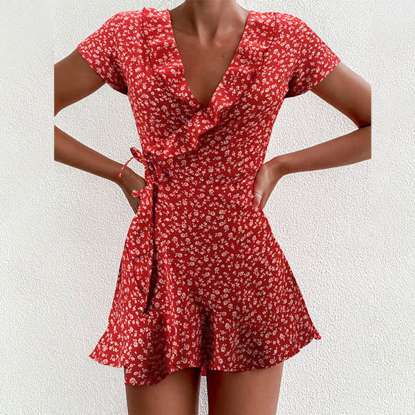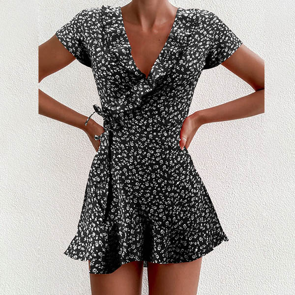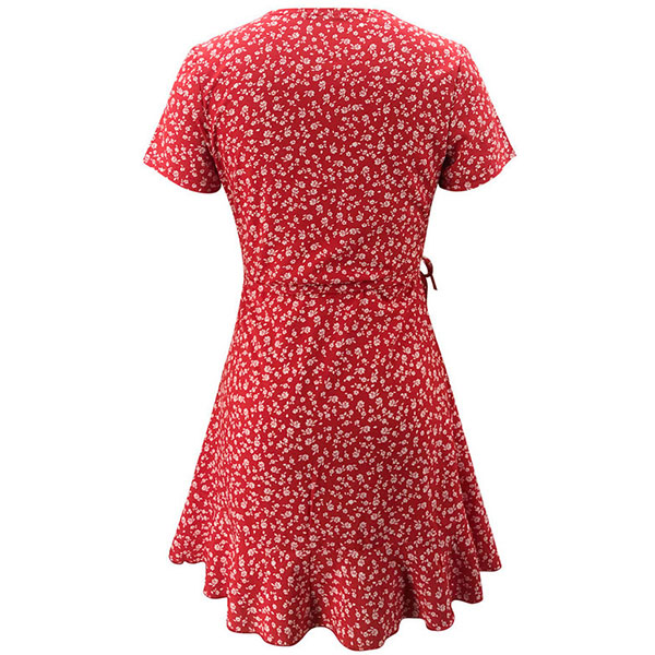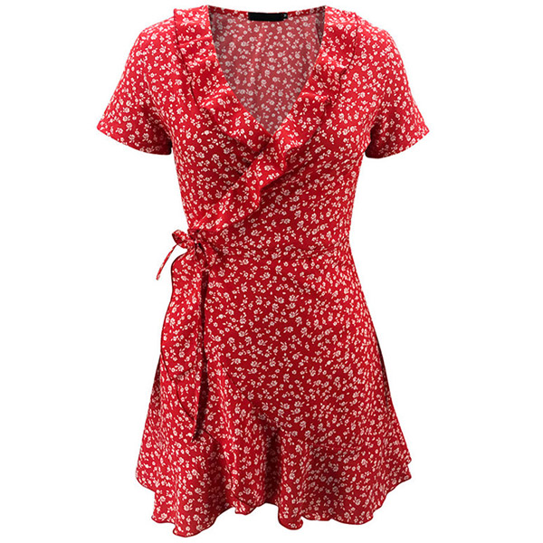 Sexy V-neck Short Sleeve Ruffle Hem Printed A-line Dress
