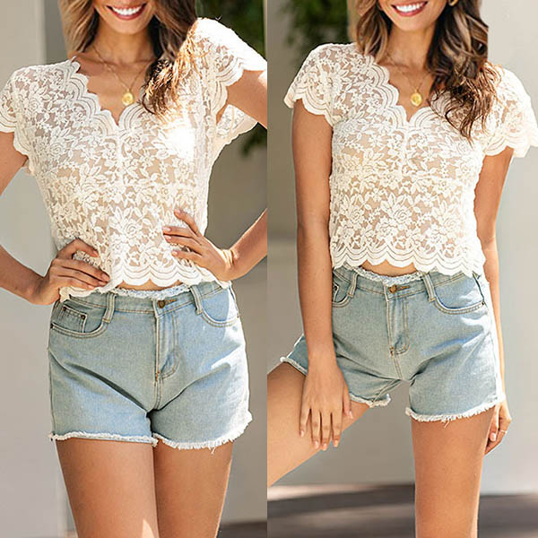 This lace top can be the secret weapon to exude your charming feminine appeal. See-through style,with short sleeve and v-neck design,sexy yet alluring. No matter matching with your denim shorts or skirts or tight pants,you can achieve for a stunning daily style.