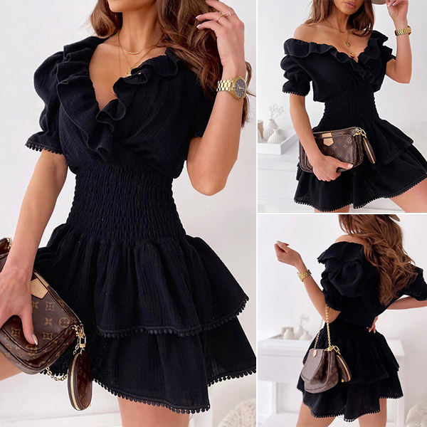 Sexy V-neck Short Sleeve V-neck High Waist Ruffle Cake Dress