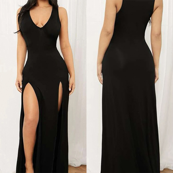 This black dress features a seductive V-neckline, sleeveless design, and a daring high-slit. It creating a captivating and glamorous look that is perfect for special occasions or events.