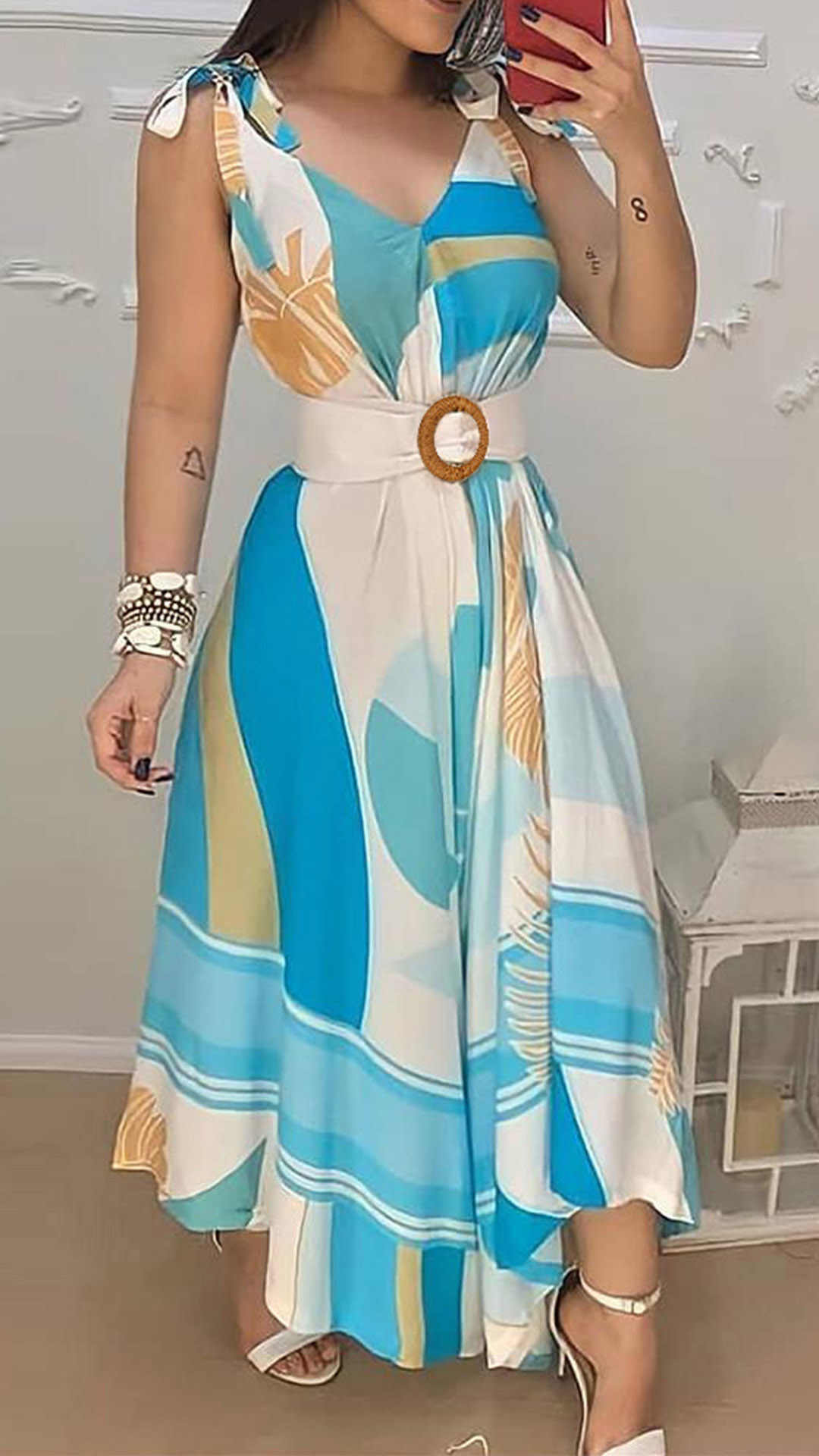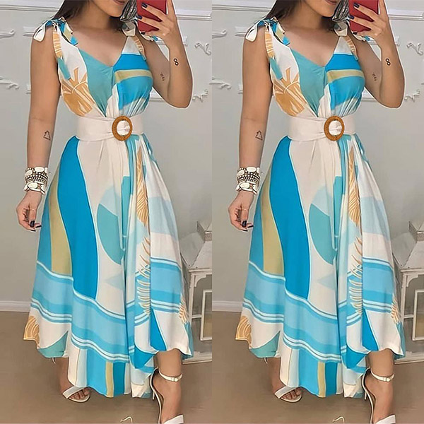 Wanna catch more eyes? Then you can just have a try this printed dress! It is finished with sleeveless,v-neck,high waist and an irregular hem,this dress not only can showcase your slender figure,but also can exude your charming feminine appeal.