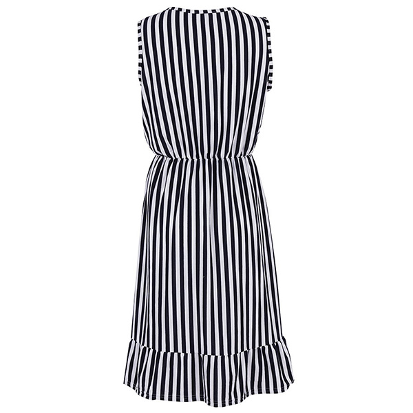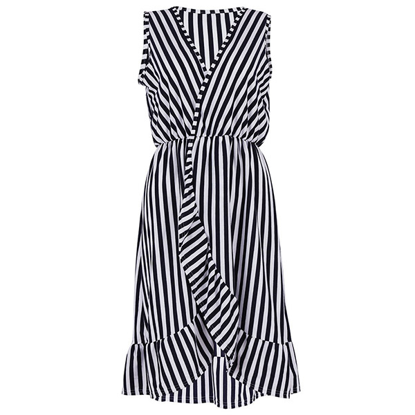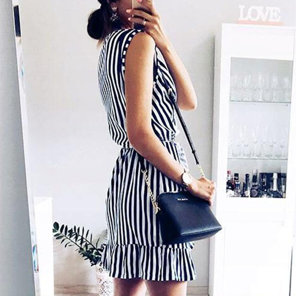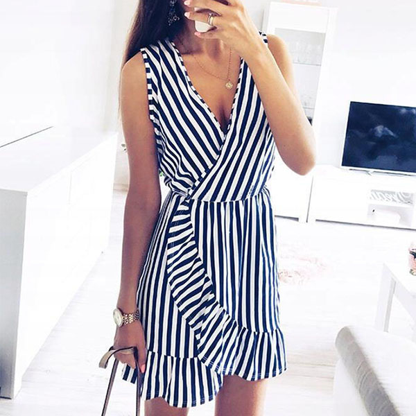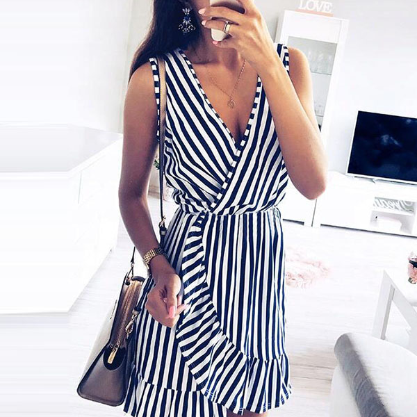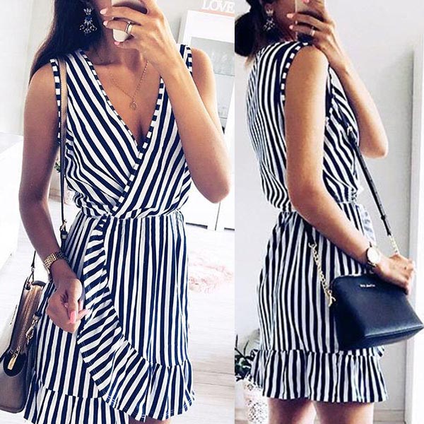 For these summer days,this sleeveless dress can easily strike your mind. The stripe element design makes it look stylish and popular,while the v-neck and irregular hem design will enhance your feminine appeal. Simply need to match with your favourite heels,then you can look beautiful enough!