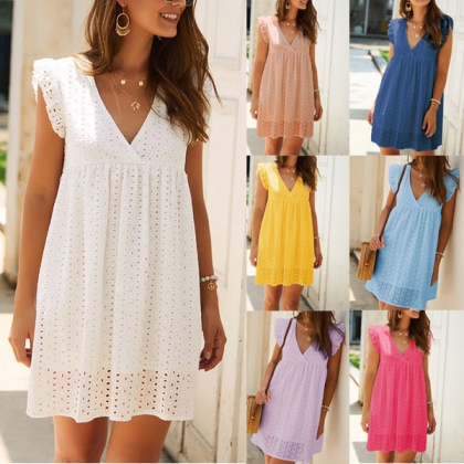 Sexy V-neck Sleeveless Solid Color Loose Lace Dress