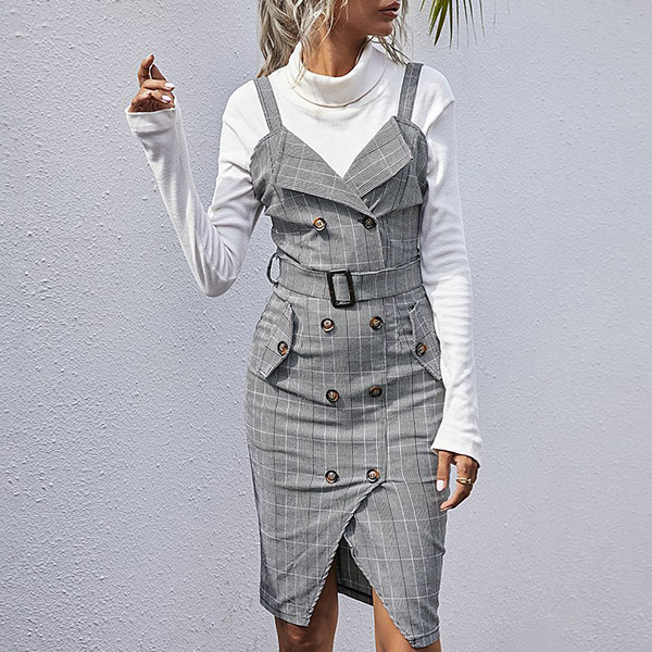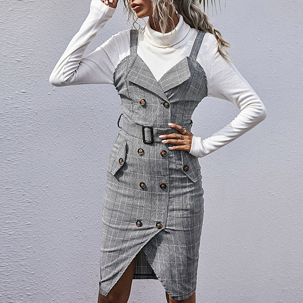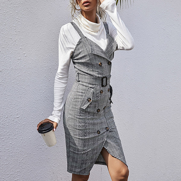 Sexy V-neck Slit Hem Double-breasted Slim Fit Sling Plaid Dress