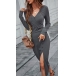 Sexy V-neck Slit Hem Front-button Long Sleeve Solid Color Slim Fit Dress