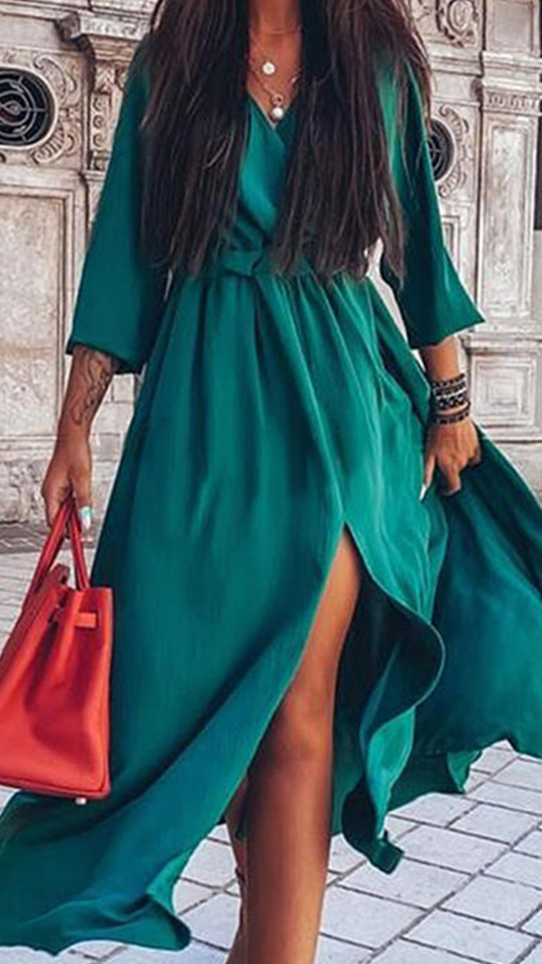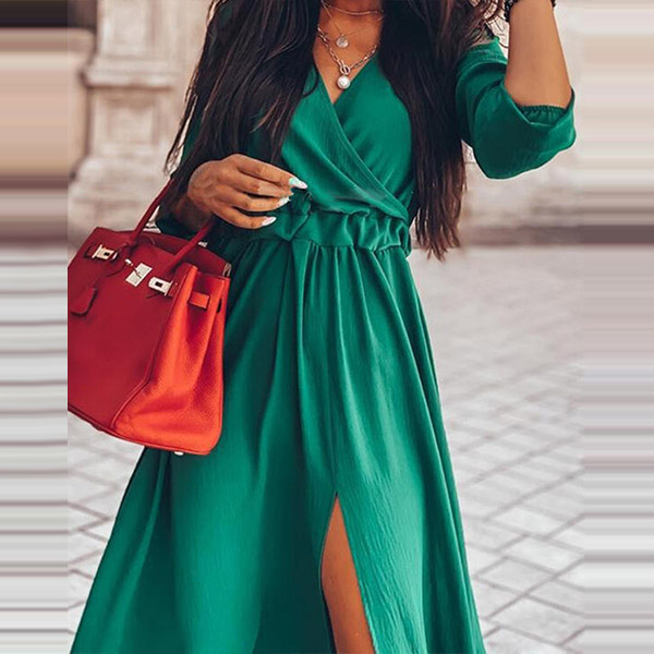 For your daily out,you can trust in this dress to win more eyes. Solid color tone design makes it look simple yet generous,while the v-neck and slit hem design will exude your sexy,flirty and feminine side,while the high waist design will showcase your slender figure. Just add this dress to your wardrobe to make it have an update.