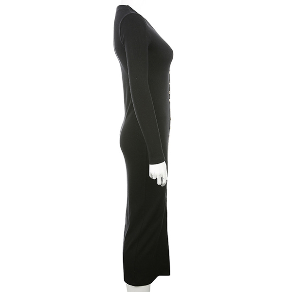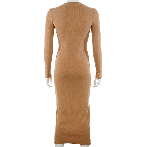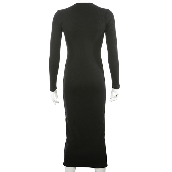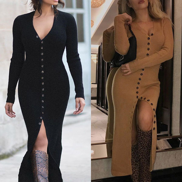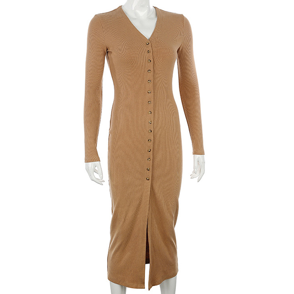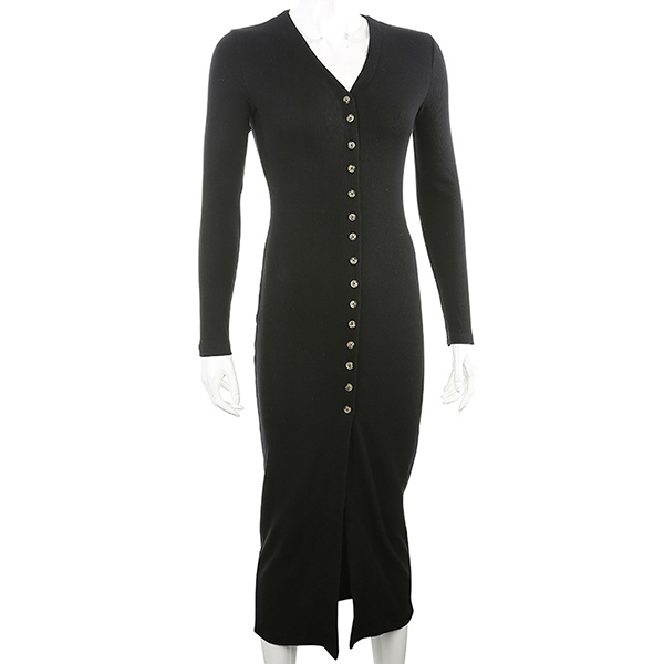 Sexy V-neck Slit Hem Long Sleeve Single-breasted Slim Fit Dress