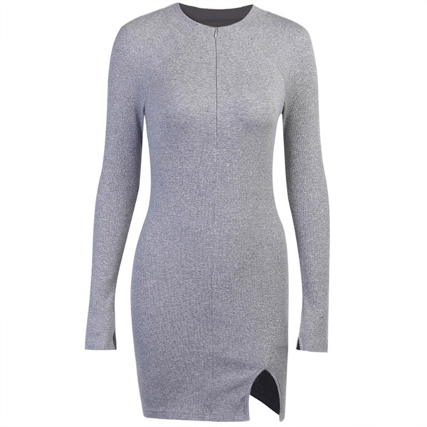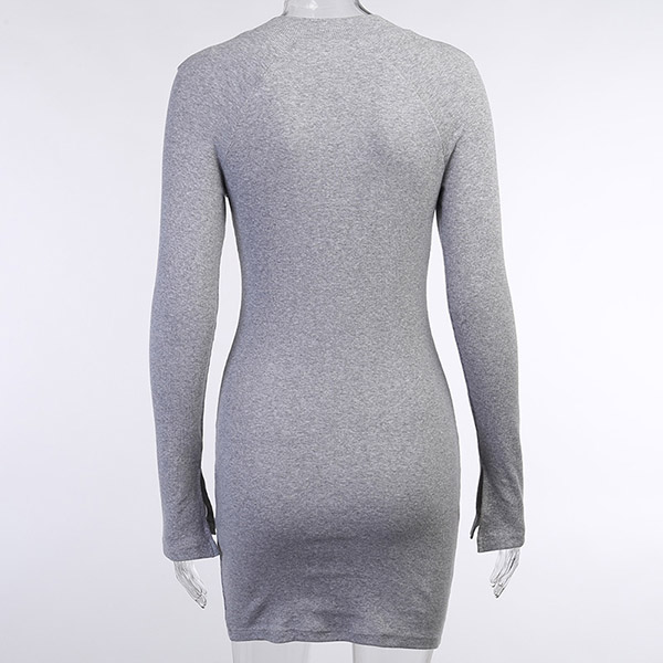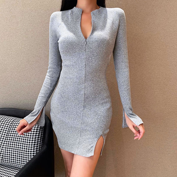 Sexy V-neck Slit Hem Long Sleeve Solid Color Slim Fit Dress