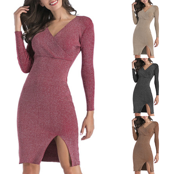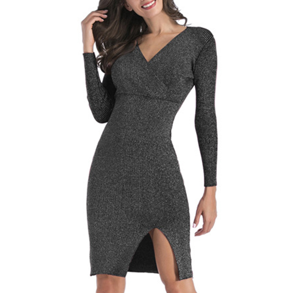 Sexy V-neck Slit Hem Long Sleeve Solid Color Slim Fit Knit Dress