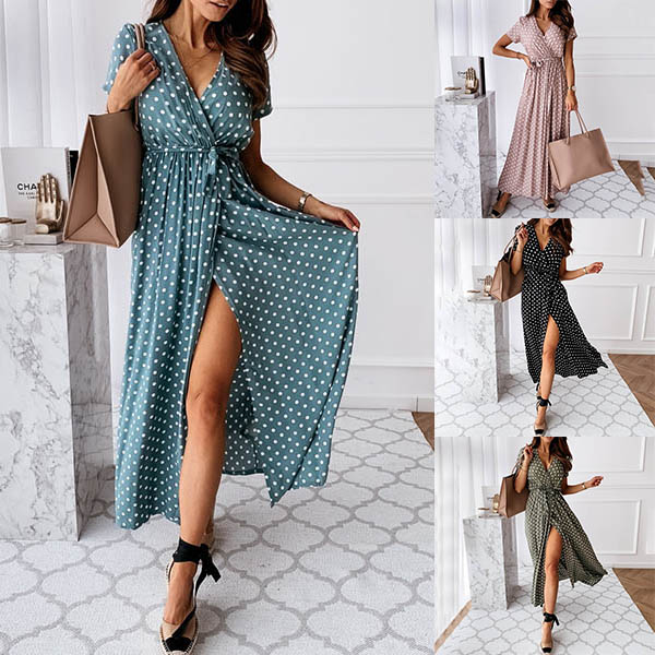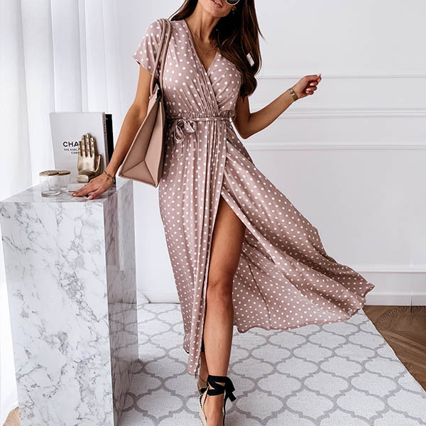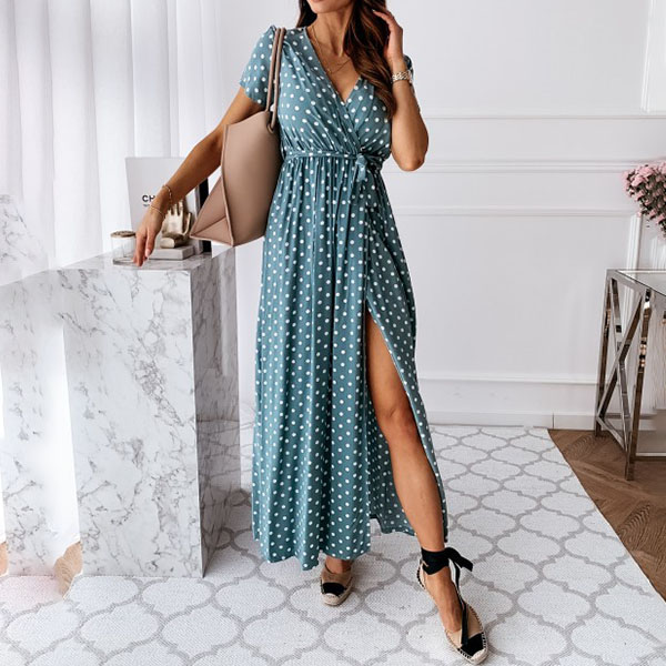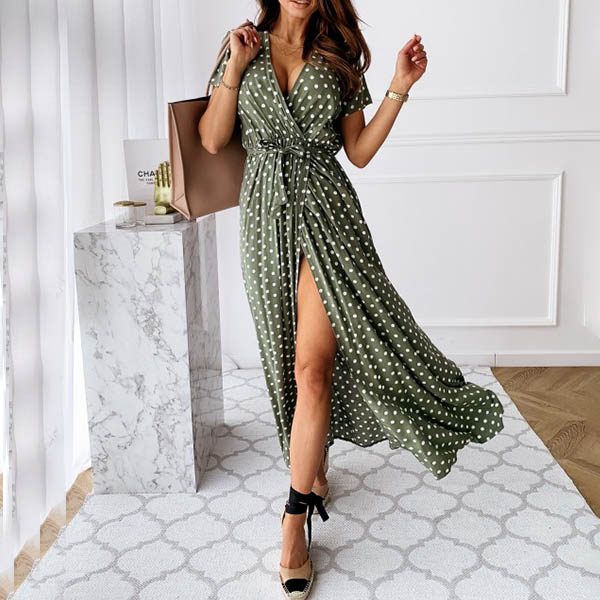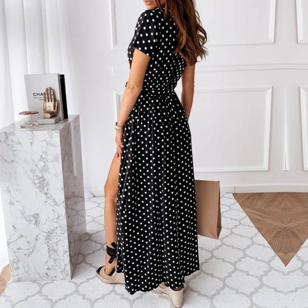 Sexy V-neck Slit Hem Short Sleeve Dots Printed Dress