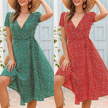 Sexy V-neck Slit Hem Short Sleeve High Waist Printed Dress
