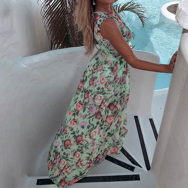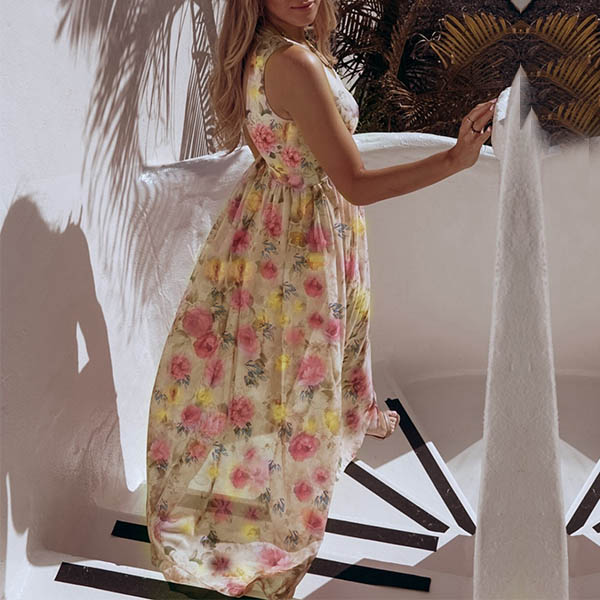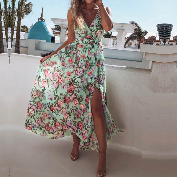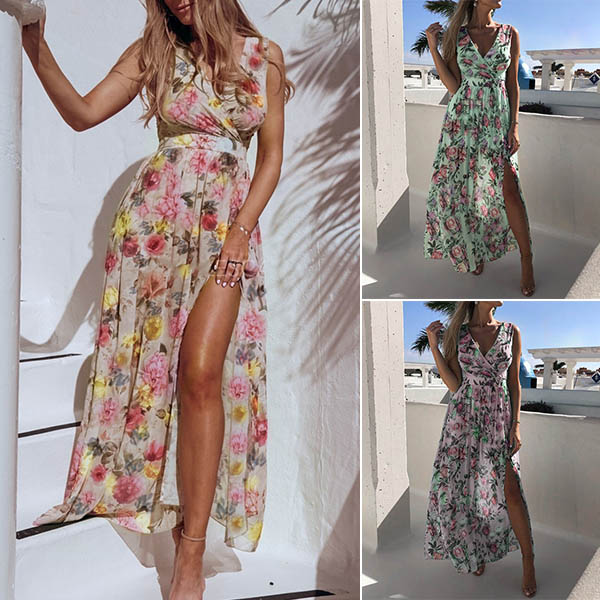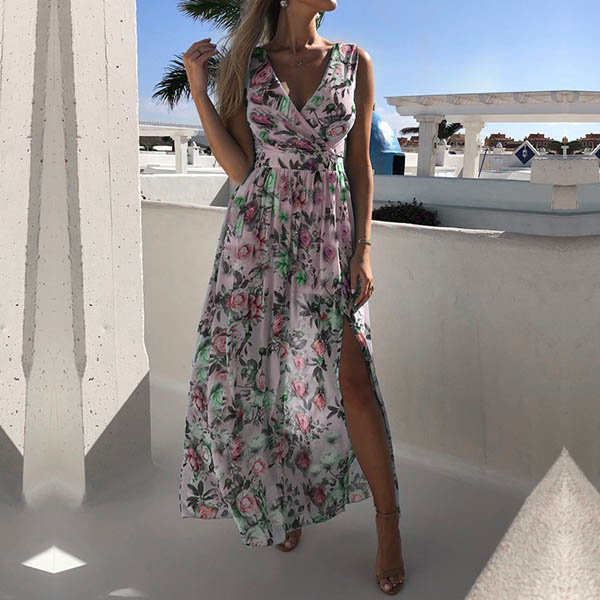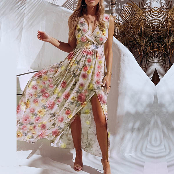 Showcase your sexy and charming summer style through this beautiful dress. Its vibrant floral print details can make you look more eye-catching,while the v-neck and slit hem design can enhance your feminine appeal. You can trust in this wonderful dress to have a happy and memorable day.