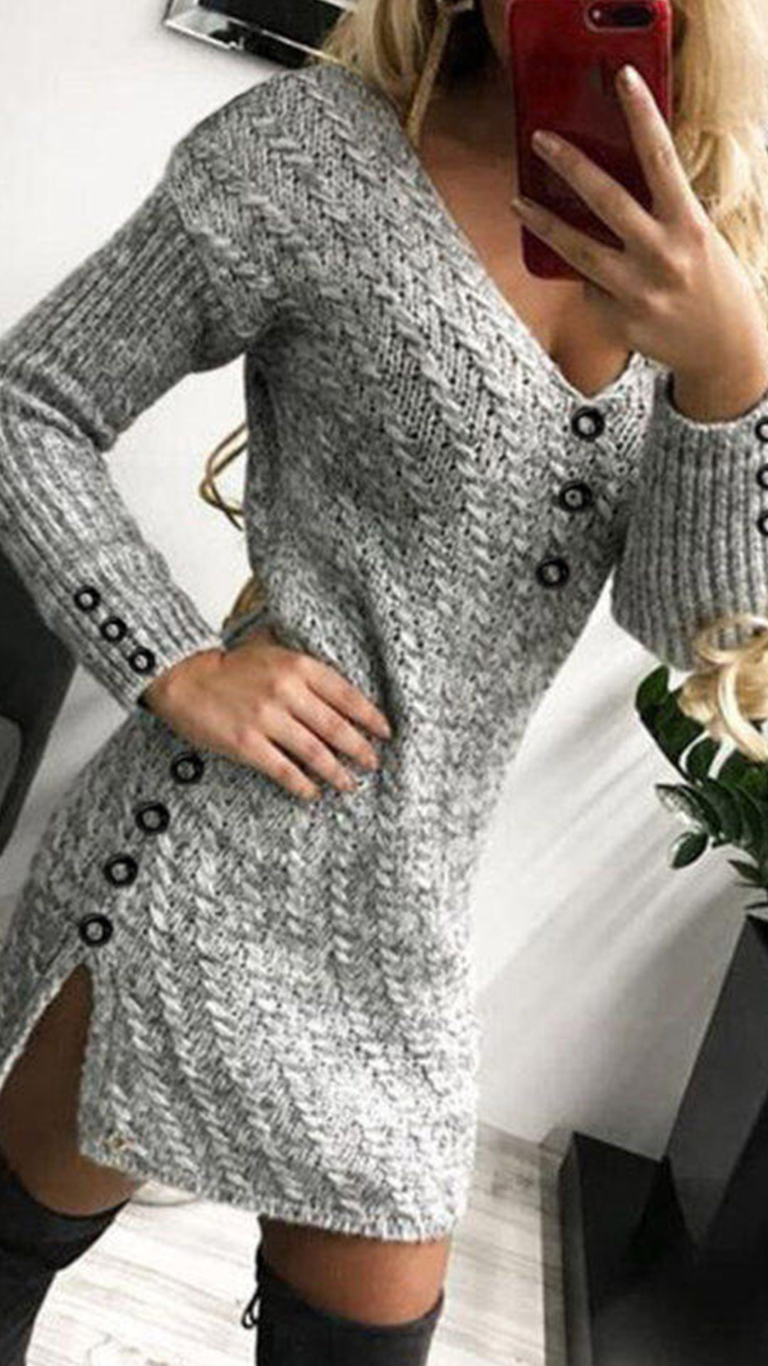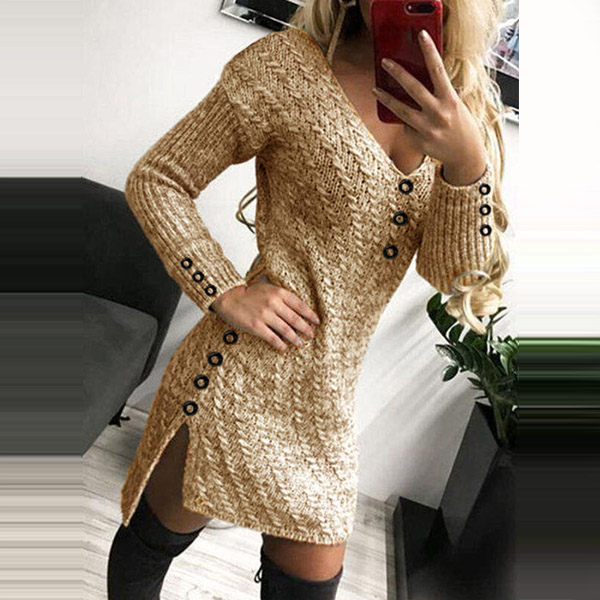 Sexy V-neck Slit High-low Hem Long Sleeve Slim Fit Button Knit Dress