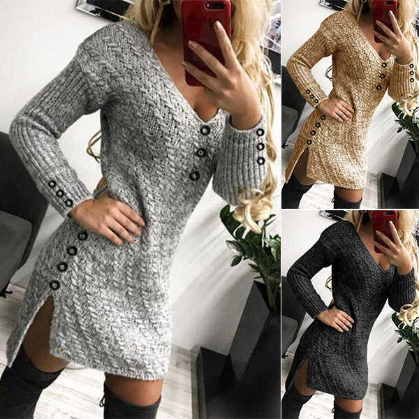 It is a good chance to give your wardrobe a seasonal update by adding this knit dress. The button details,high-low hem with slit design make this piece full of style and charm,while the soft,breathable knitted fabric can ensure you a warm and comfortable day. When the days get cold,this knit dress can be your wardrobe staple.