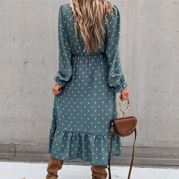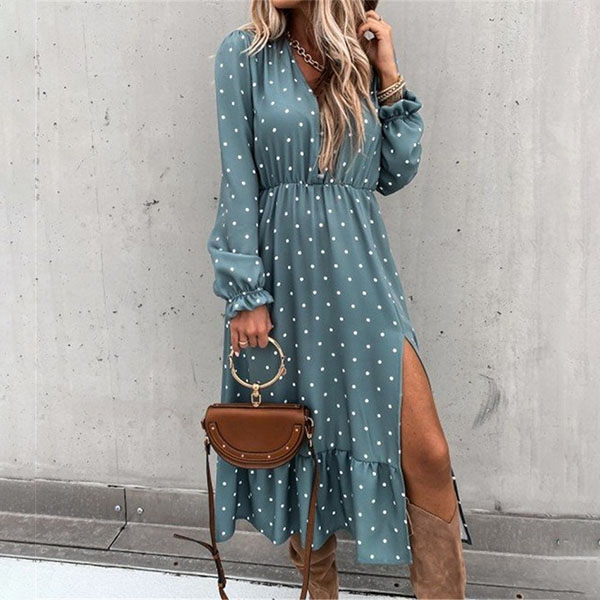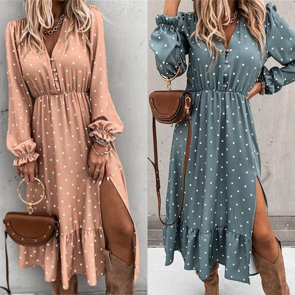 When you are invited to a dinner date,you can just slip into this dress to stay beautiful and charming. The v-neck and ruffle hem with slit design can lend you a dash of sexy and flirty vibes,while the dots printed details can make you look more playful. Dress it up with your sexy heels for a beautiful look.
