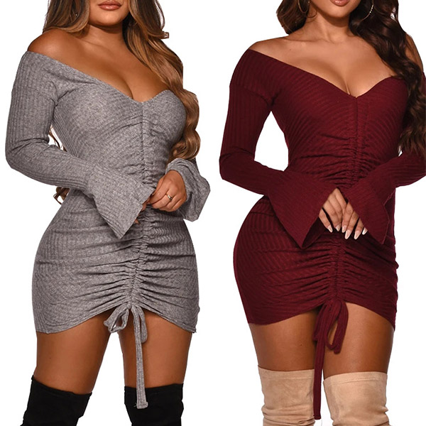 Sexy V-neck Trumpet Sleeve Slim Fit Drawstring Dress