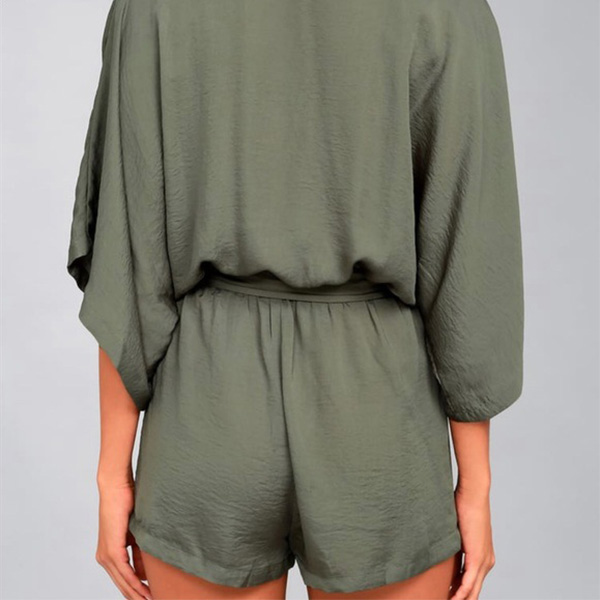 Sexy V-neck Trumpet Sleeve Solid Color Romper with Waist Strap