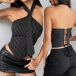 Sexy Vertical Striped Halter Neck Irregular Hemline Back Lace-up Crop Shirt