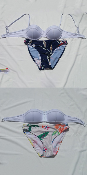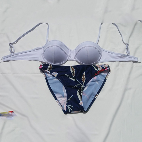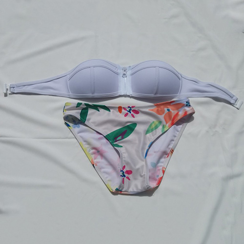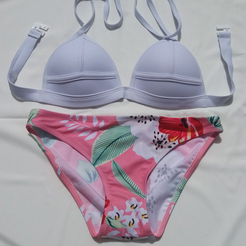 Enjoy your sun-soaked beach days with this bikini set. Including a white bra and a printed triangle briefs,