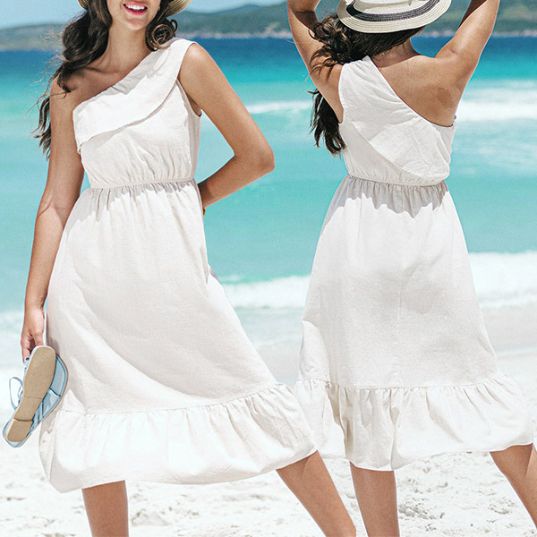 This stunning white dress is perfect for beach vacation! The one-shoulder design is accented with ruffles and a tiered skirt. Hope you like it.