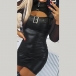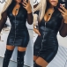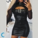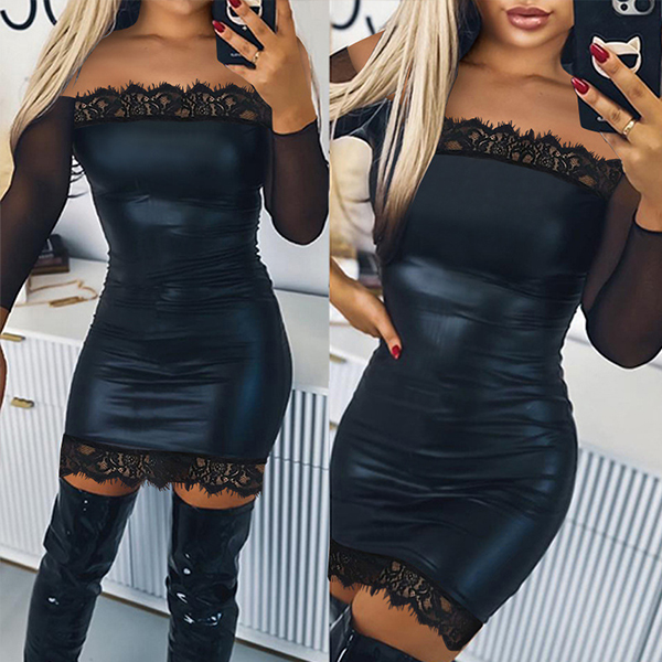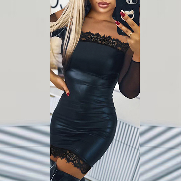 Sexy Zipper/Lace Spliced/Front Cutout Long Sleeve Artificial Leather PU Bodycon Dress