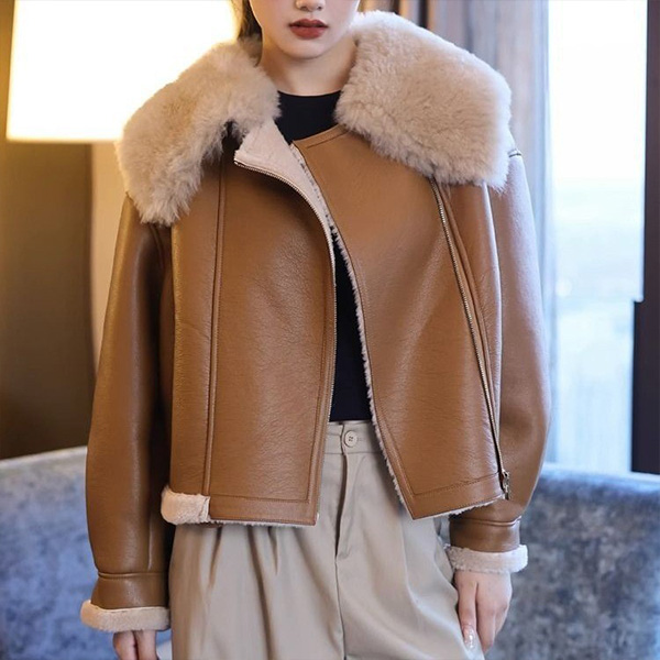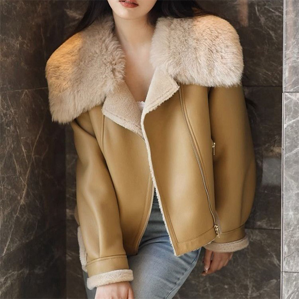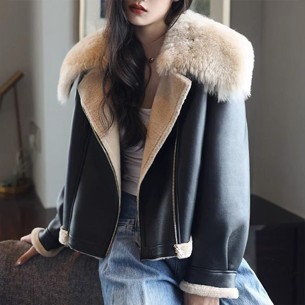 Short Moto Style Faux Fur Coat with Lamb Inspired Lapel