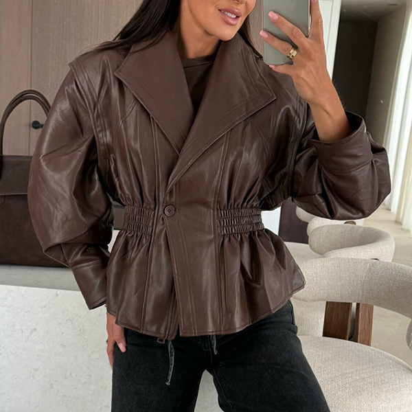 Fashion Puff Sleeve Lapel Cinched Waist Artificial Leather PU Crop Jacket