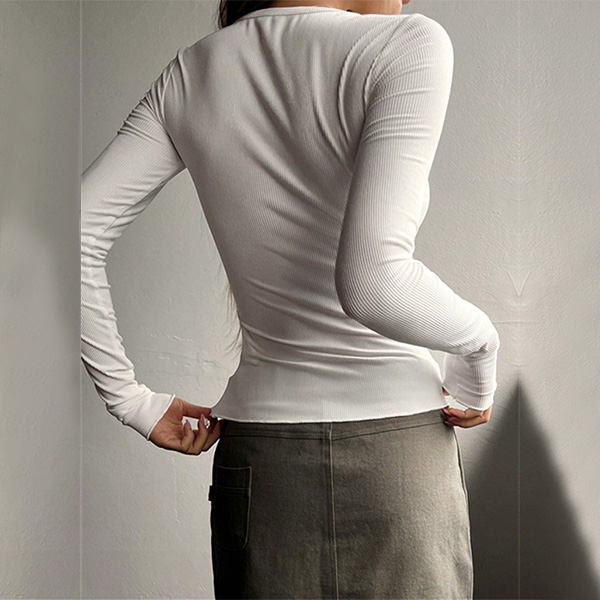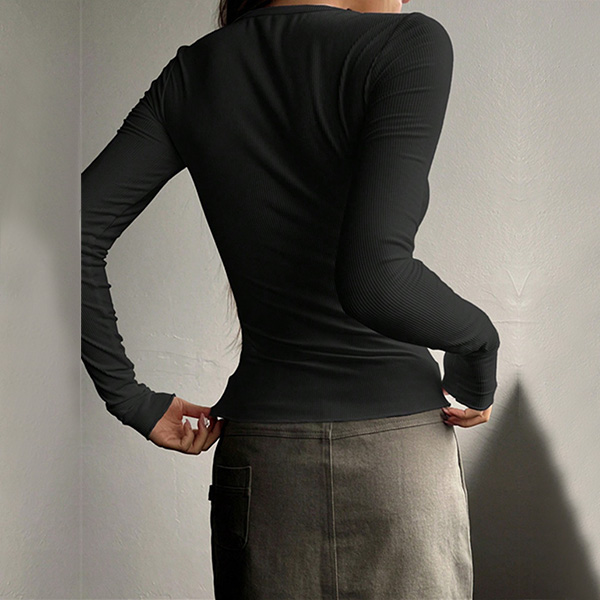 Simple Solid Color Buttoned V-neck Long Sleeve Ribbed Shirt