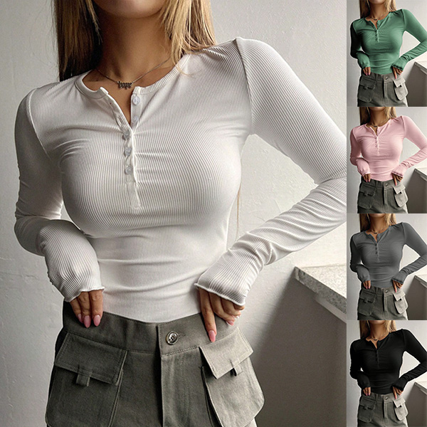 Crafted with high-quality ribbed fabric, this shirt offers a comfortable and stretchy fit. The buttoned V-neckline and long sleeves, this shirt exudes a chic and refined vibe. Multi-colors avabile.