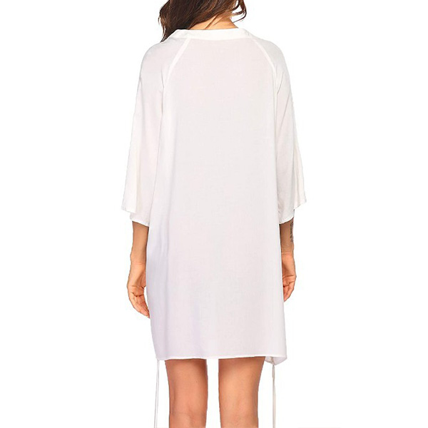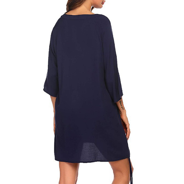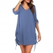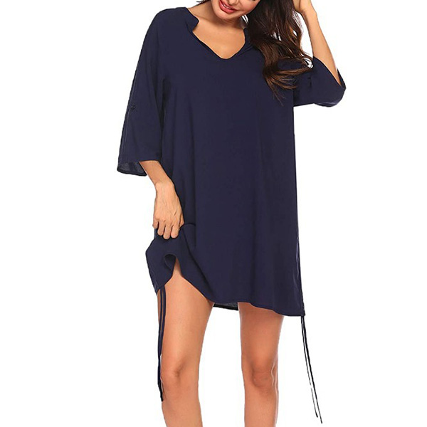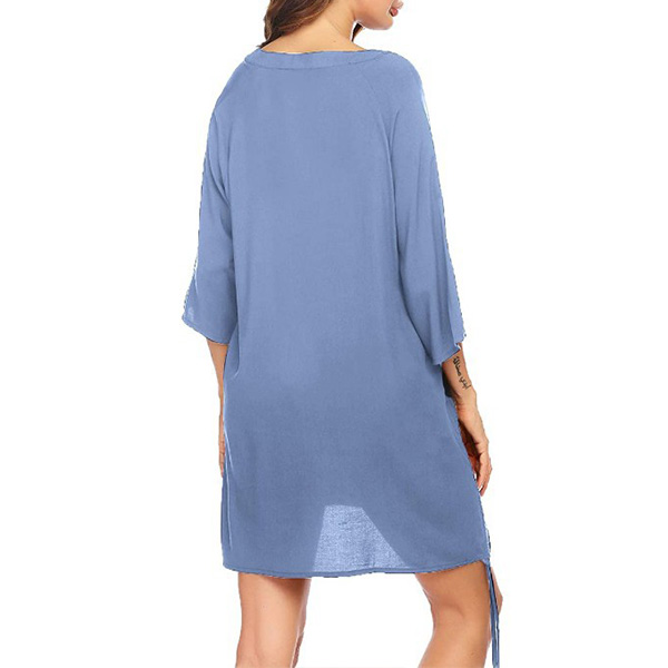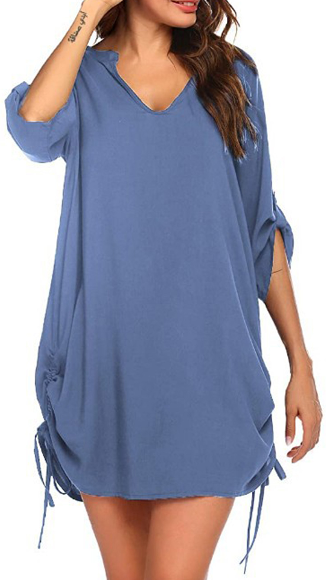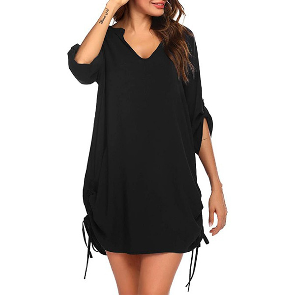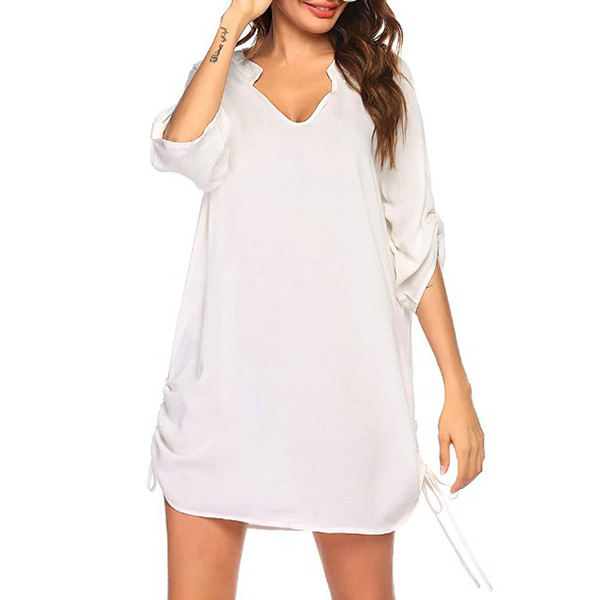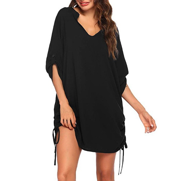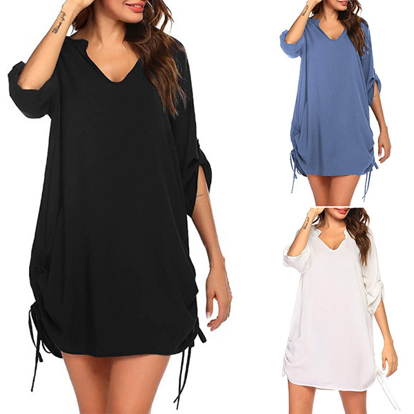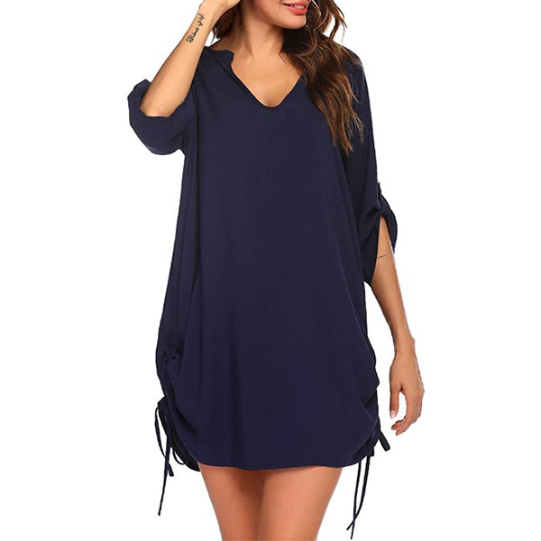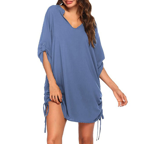 Wanna achieve for a chic and unique beach look? Then you can just have a try this bikini smock. It comes with a solid color,finished with 3/4 sleeve,v-neck and side-drawstring design,this piece definitely can keep you cool and comfort all the day. Perfect fit for matching with your sexy bikini set.