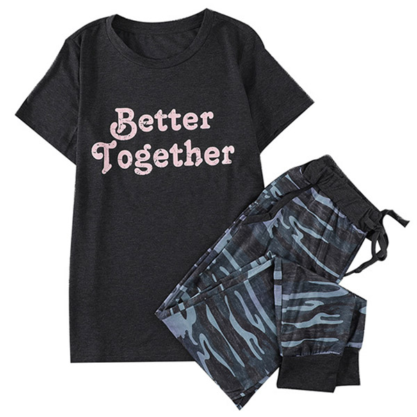 Vous méritez de bénéficierdu plus grand confort pendant vos moments à la maison. Alors laissez cetensemble de vêtements d'intérieur vous donner ce sentiment. Composé d'unt-shirt à manches courtes et à col rond et d'un pantalon, conçu avec desdétails imprimés de lettres et de camouflage, cet ensemble deux-pièces permetnon seulement de rester à l'aise, mais aussi de conserver un style décontractéet relaxant.