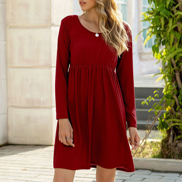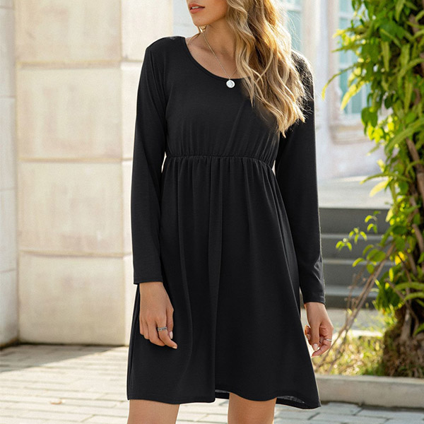Simple Style Long Sleeve Round Neck High Waist Solid Color Dress