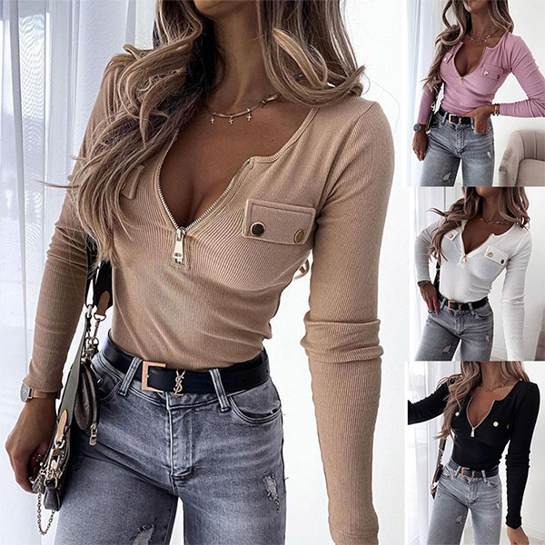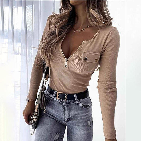 Crafted from soft and breathable knitted fabric,this wonderful top can give you an all-day comfort. Solid color style,the zipper neckline design will add some extra charm. Finished with long sleeve,round neck and a fit silhouette,this piece can showcase your perfect body-line.