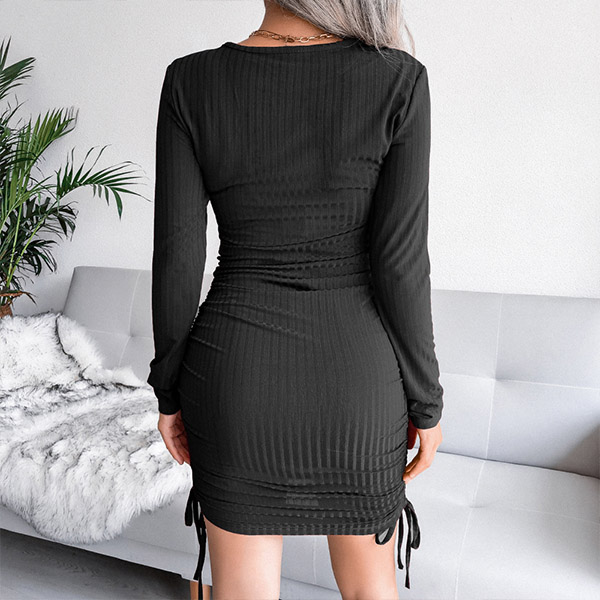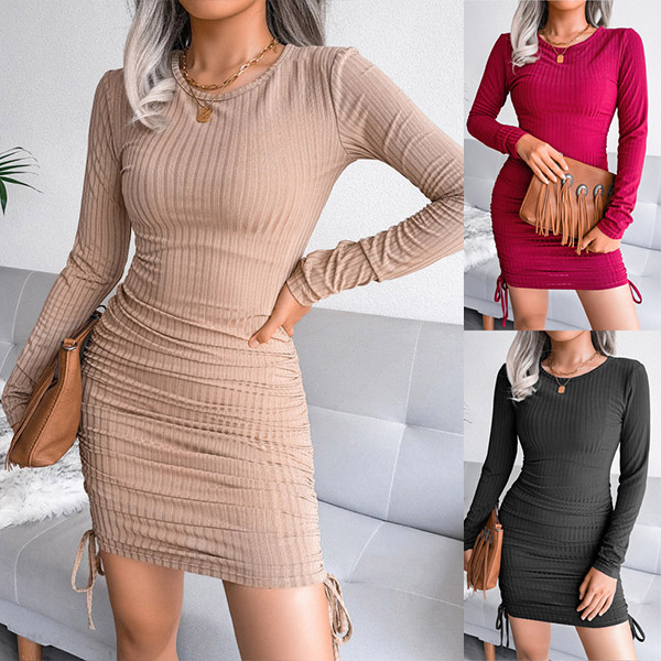 Simple Style Long Sleeve Round Neck Solid Color Side-drawstring Slim Fit Dress
