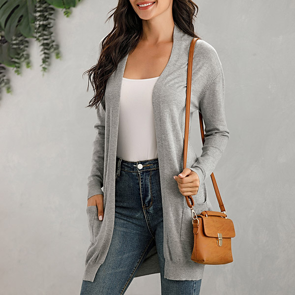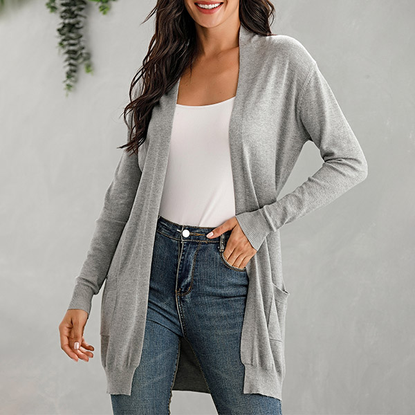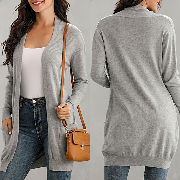 For these neither too cold days nor too hot days,this knit cardigan can be a good choice. Solid color tone design makes it look simple yet generous. Finished with long sleeve,a clean silhouette and front-pocket design,this cardigan can be matched with different style outfits.