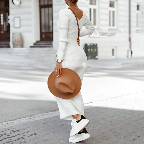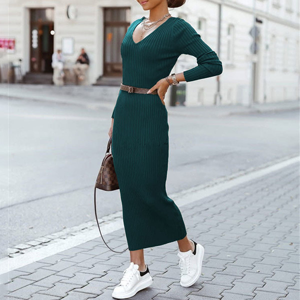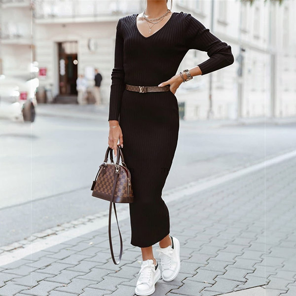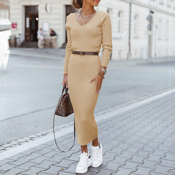 Nowadays,the simple style outfit is becoming more and more popular since it can offer you more matching styles,and this piece is a good example. Solid color style,finished with long sleeve,v-neck and a fit silhouette,this knit dress not only can showcase your slender figure,but also can exude your charm and personality. You can match with a thin waistband if you wanna enrich your dress up.
