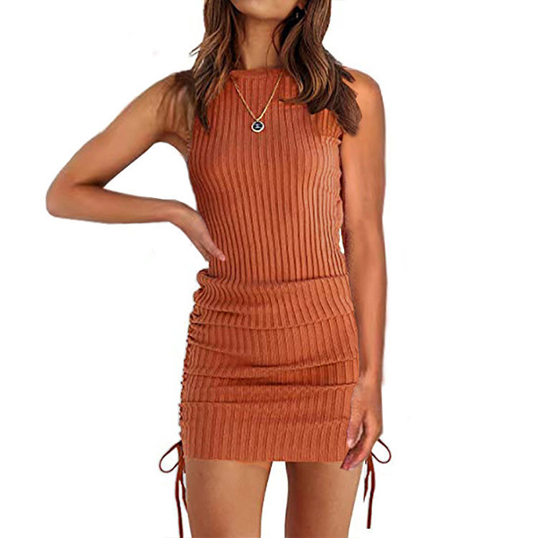 As we all know,the simple style dress can offer us more matching opportunities,and this piece is the good example. Finished with sleeveless,round neck,side-drawstring and a tight silhouette,this dress also can showcase your slender figure. You can wear it alone or match with your jackets or cardigans.