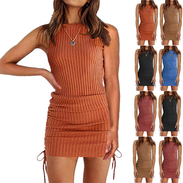 Simple Style Sleeveless Round Neck Side-drawstring Solid Color Slim Fit Dress