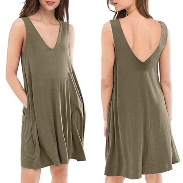 For these hot summer days,this tank dress can easily strike your mind. It boasts a solid color,the backless and v-neck design will expose your sexy and flirty vibes,while the loose silhouette and front-pocket design can offer you a casual,relaxed yet cozy style. Invite one to your summer wardrobe ensemble!