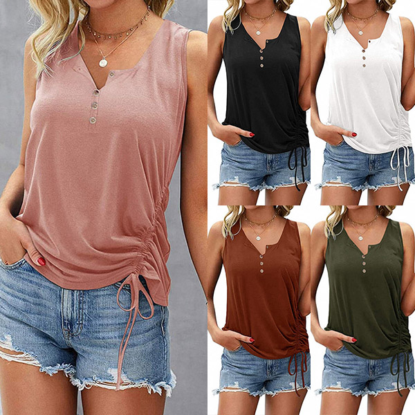 As one of the summer essentials,this simple,cozy yet stylish tank top is yearning for a place in your wardrobe. Solid color style,the v-neck and side-drawstring design break the classic and traditional design style,while its soft and breathable fabric can ensure you a cool and comfortable day. Match with your shorts to enjoy your summer days.