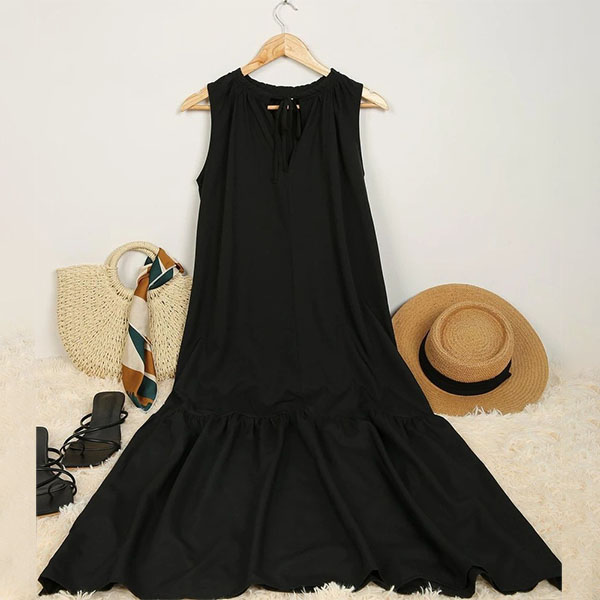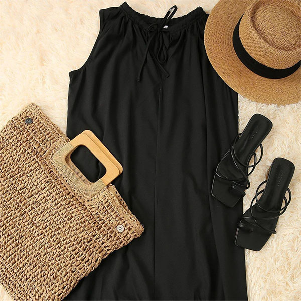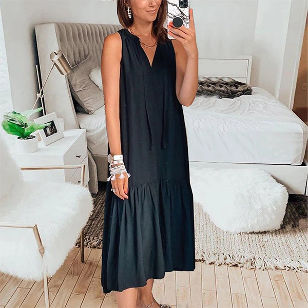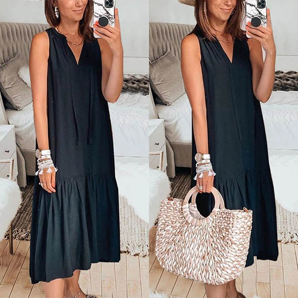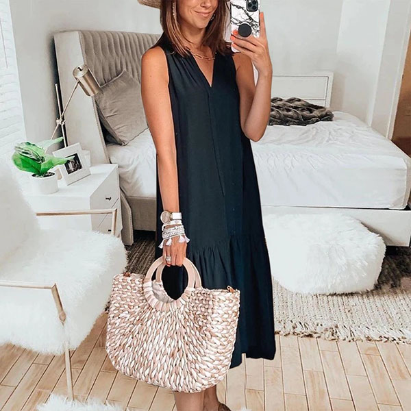 Boasts a solid color,with sleeveless and v-neck design,this dress bears a simple design style,but it knows how to exude your style and personality. Moreover,the soft,breathable fabric and loose silhouette design can ensure you a comfortable day. For the hot summer days,this sleeveless dress would be your wise choice.