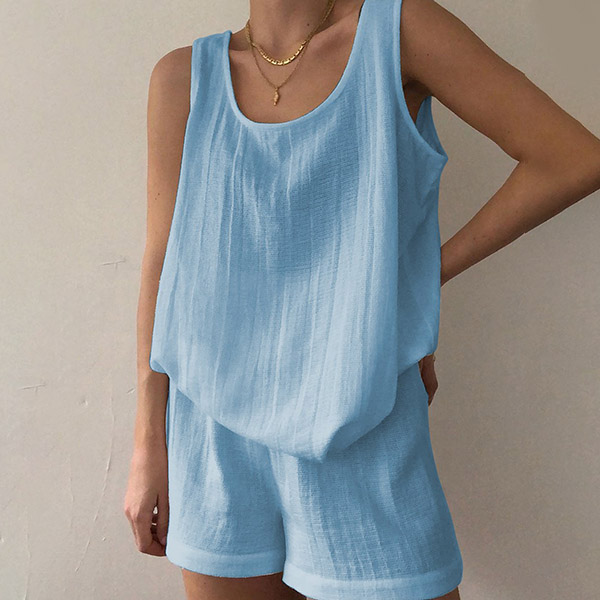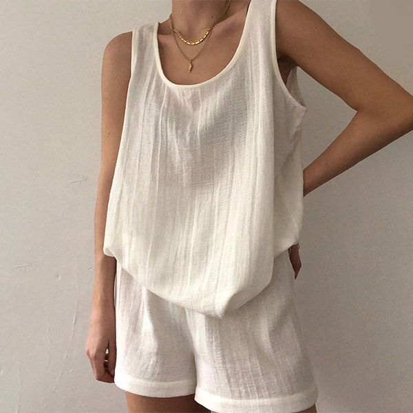 For these hot summer days,this two-piece set would be your wise choice when you have no time to do your daily matching. Solid color style,including a sleeveless round neck top and a shorts,its soft and breathable fabric can ensure you a cool and comfortable day. Perfect fit for your home time and off-duty days.