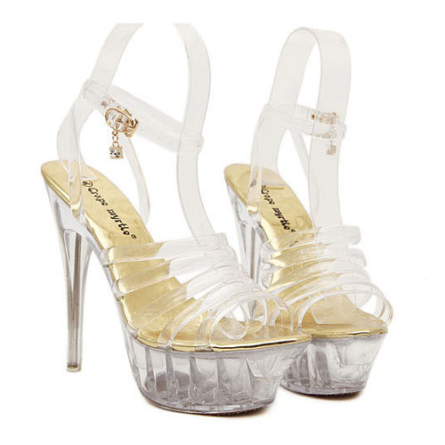 The pair of unique sandal features transparent straps and stiletto heels,gold(or silver)tone lining,an open toe and back,1.97" platform,with a side metal buckle closure.Wear it with your sexy dress.