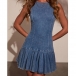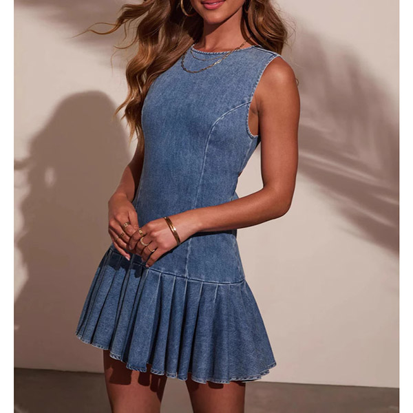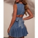 Fashion Crew Neck Sleeveless Back Cutout Self-tie Bowknot Pleated Hemline Old-washed Denim Dress